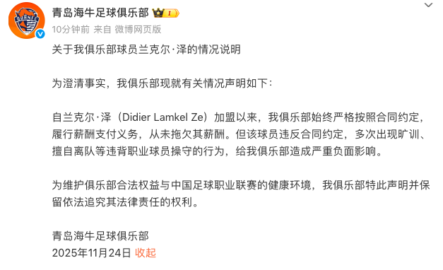 北京时间11月24日晚,中超青岛海牛俱乐部官方发文,回应了关于外援兰克尔-泽的欠薪指控。
