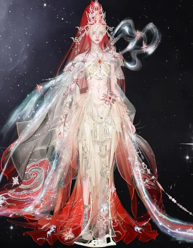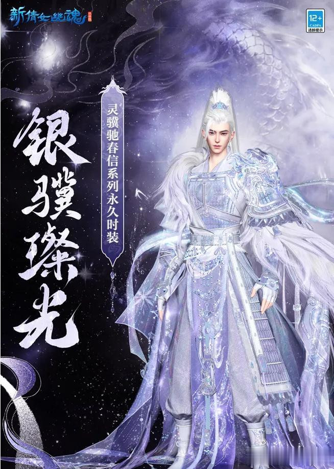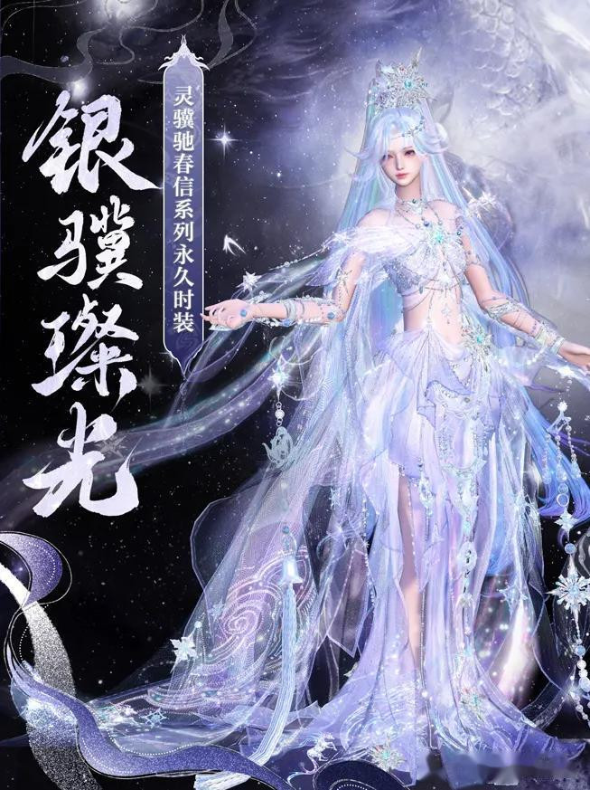 既然是新年新衣爆料,咱们必须把这套时装给大家盘明白了。马年灵骥驰春信系列外观包含时装·银骥璨光和玄骐藏锋。先跟大家唠银骥璨光,这套我愿称之为马年新衣的扛鼎之作,紧扣天马与星霜两大意象,既有星河的浩瀚无垠质感,璀璨夺目的效果即使是平面图片也跃然纸上。