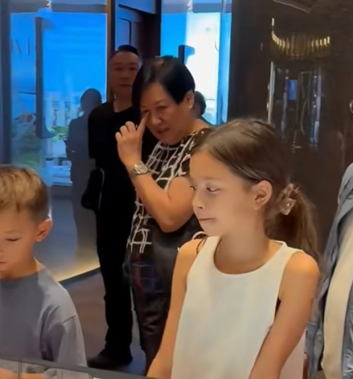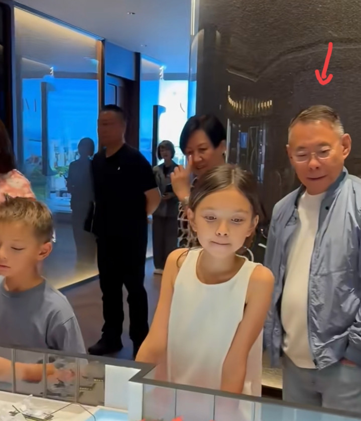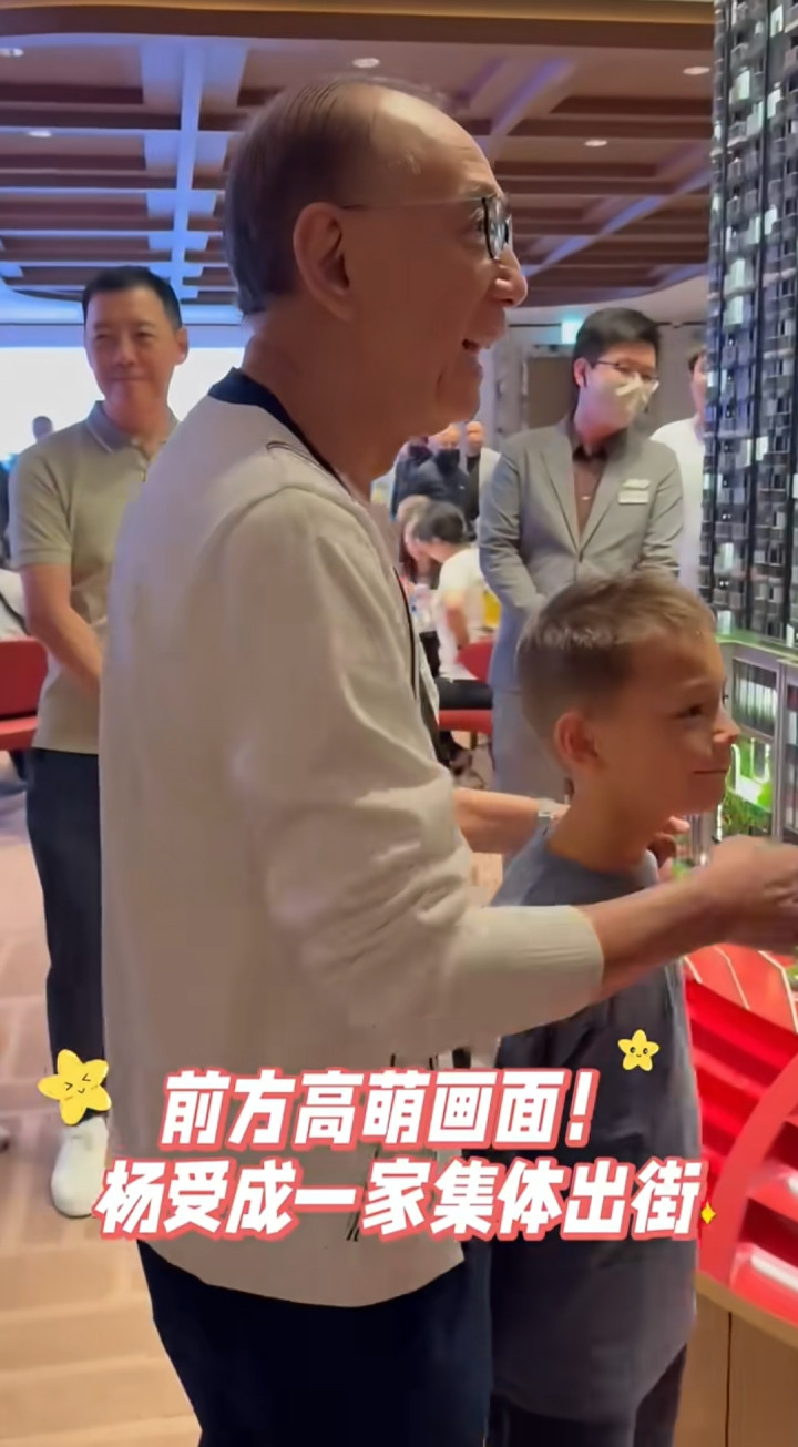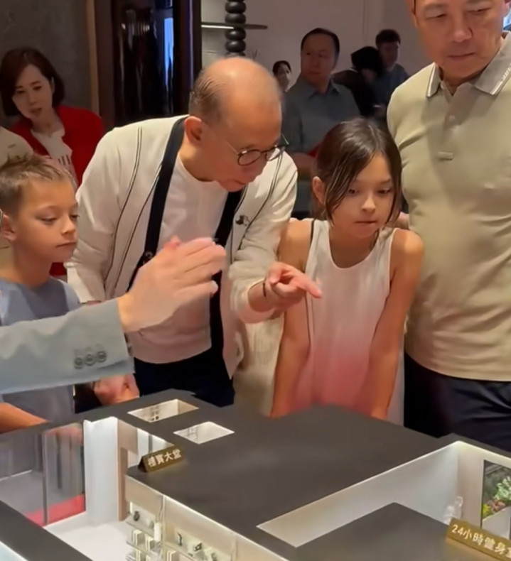杨受成虽说有82岁了,但状态保持得还很年轻,一身老钱风打扮,看着比平时更亲近和蔼,一直笑眯眯的。在现场看房时,还很有耐心地俯身跟孙子孙女介绍楼盘模型,一边还牵着小孙子,看得出他对大儿子的这俩混血孩子都是宠得不行。