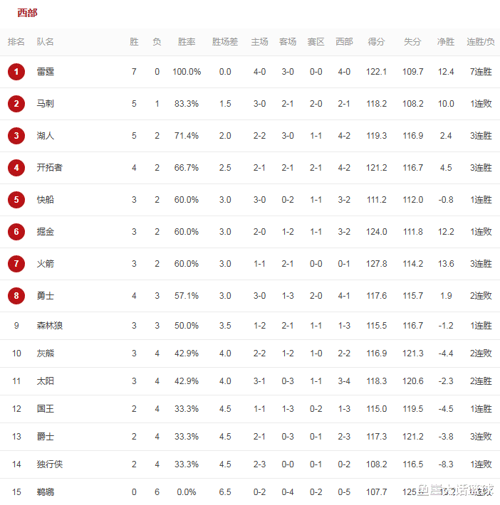 北京时间11月3日NBA进行了8场常规赛,这些比赛完毕之后NBA最新排名正式出炉。雷霆在今天的比赛中对阵鹈鹕,这场比赛也是没有太多的悬念,毕竟鹈鹕在本赛季的表现太过糟糕,而这场比赛亚历山大早早找到进攻状态,加上维金斯等人也在比赛中有着优异的表现,所以雷霆很快就拉开比分,最终雷霆大胜鹈鹕。这场比赛后雷霆豪取7连胜排在西部第一的位置,反观鹈鹕惨遭6连败排在西部倒数第一的位置,而且鹈鹕也成为西部唯一 一支未尝一胜的球队。