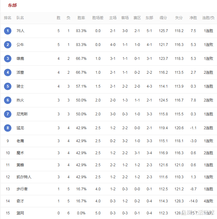 76人在今天的比赛中对阵篮网,这场比赛76人虽然是缺少了恩比德,但是马克西在场上有着稳定的发挥不说,同时这场比赛中76人探花埃奇库姆和格莱姆斯也有着不错的表现,加上乌布雷也一度在比赛中打出爆发表现,因此这场比赛的悬念也没有持续太久,最终76人大胜篮网。而在这场比赛后76人更是以5胜1负的战绩升到了东部第一的位置,篮网则遭遇6连败排在东部倒数第一的位置,同时篮网也是东部这边唯一 一支未尝一胜的球队。同时在今天的比赛中老鹰对阵骑士,本场比赛骑士虽然一度拉开比分,但是老鹰打得坚韧追上比分,但最终在米切尔带领下,骑士还是有惊无险的赢下比赛胜利。