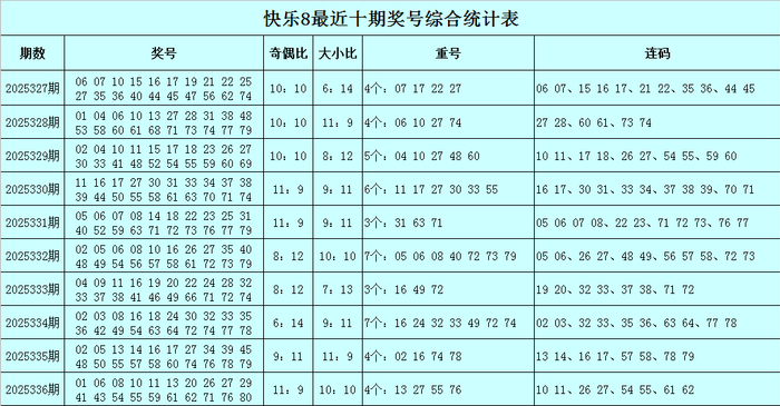 福彩快乐8第2025336期开出奖号:01 06 08 10 11 13 20 26 27 29 41 43 54 55 59 61 62 71 76 80,其中奖号奇偶比为11:9,大小比为10:10,包含4个重号13、27、55、76,包含连码10 11、26 27、54 55、61 62。