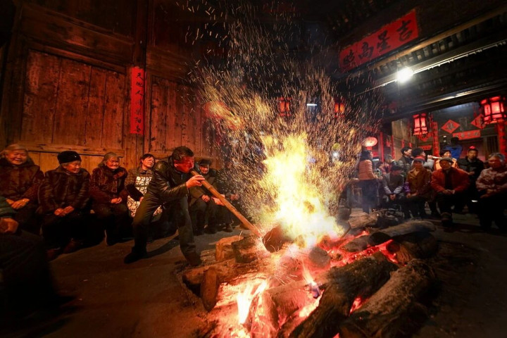 小年当晚,坪田村的篝火熊熊燃起,火光冲天,映红了半边天。村民与游客围火而坐,伴着祈福仪式的声声祝愿,看抬竹点香的传统环节轮番上演,庄重而热烈。