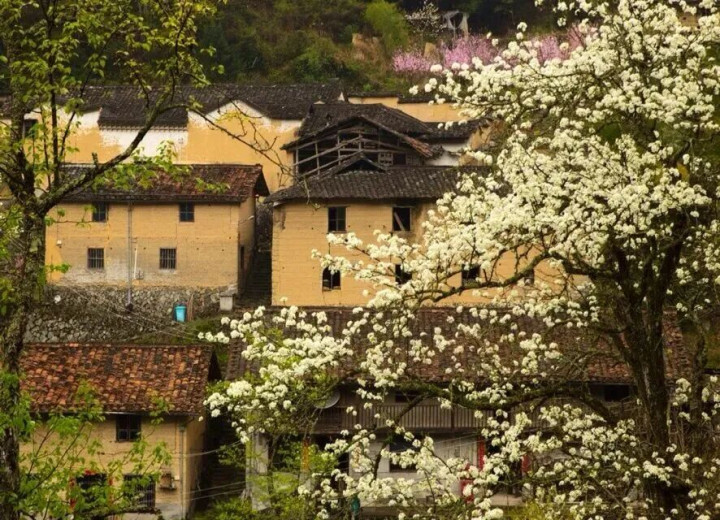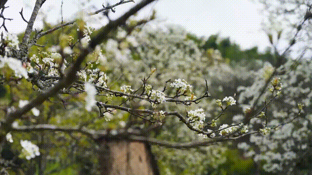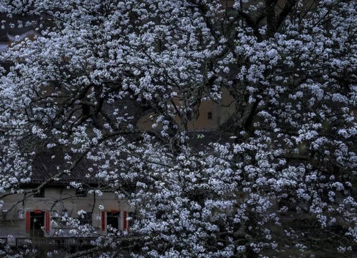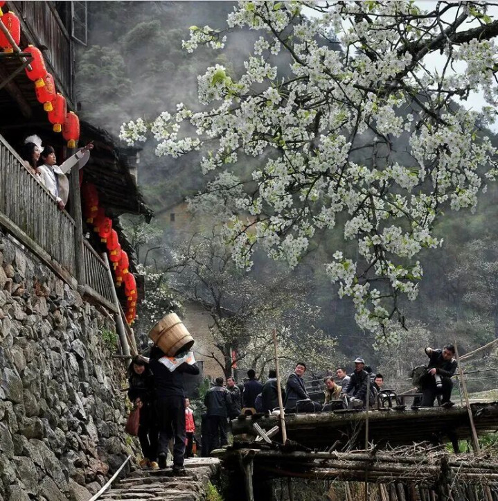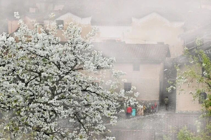 房前屋后散落着三三两两的梨树,那梨花雪白如玉,新长出来的嫩芽带着淡淡的鹅黄,在阳光照耀下很是好看。清澈透明的溪水潺潺流过,洁白如玉的梨花,古老的房子,共同组成一幅幅精美的画卷,犹如世外桃源,宁静而美好。
